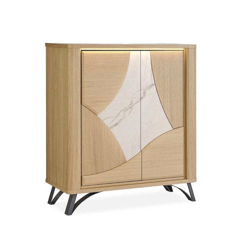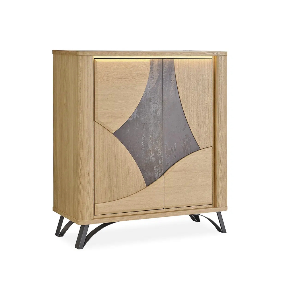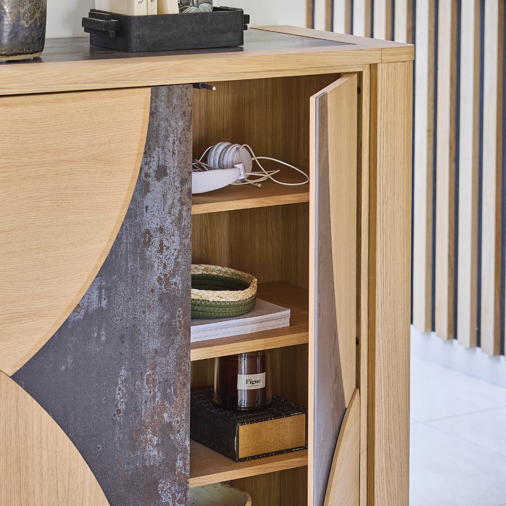 Portes bois : panneaux de fibres moyenne densité revêtus de placage chêne avec incrustation céramique - Dessus : panneaux de particules revêtus de céramique avec emboitures en panneaux de fibres moyenne densité revêtus de placage chêne - 2 finitions de céramique au choix : céramique beige veiné ou DEKTON® brun panaché - Côtés, derrières, fonds et tablettes : panneaux de particules revêtus de placage chêne - Pieds fer finition époxy gris anthracite - Portes : système push - 2 tablettes réglables, 1 tablette fixe - Éclairage LED sous plateau avec interrupteur "touch" - Bois ton brut brossé - Finition teinte acrylique, vernis de finition acrylique.