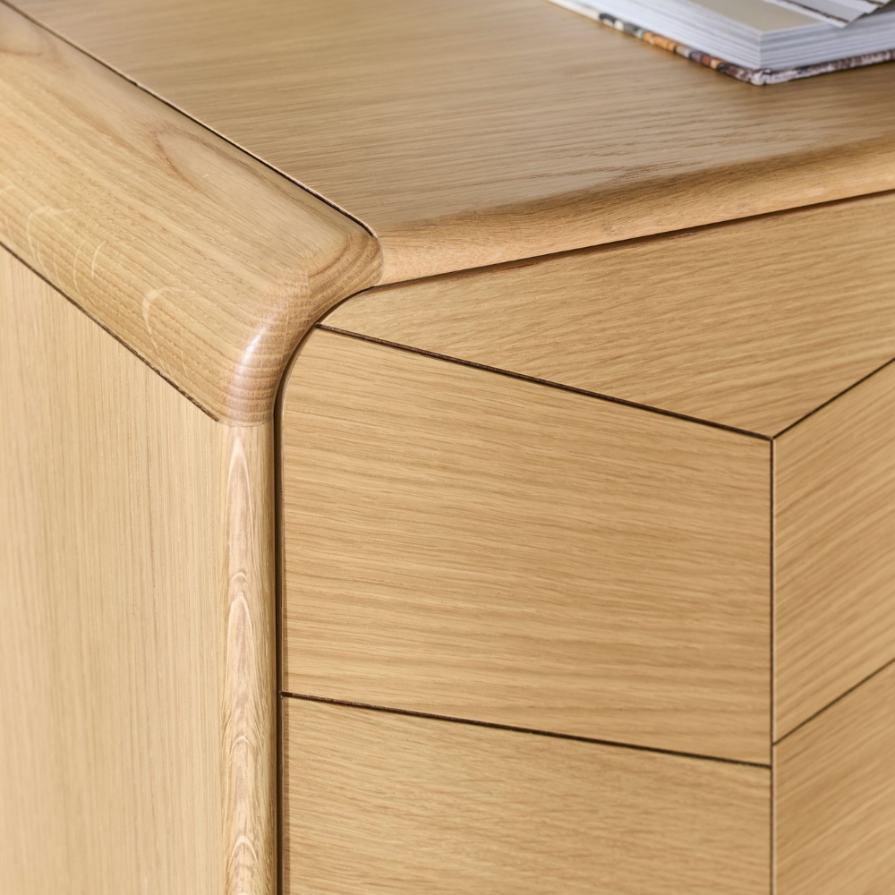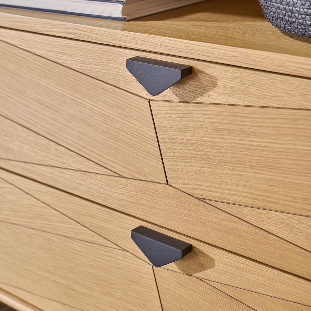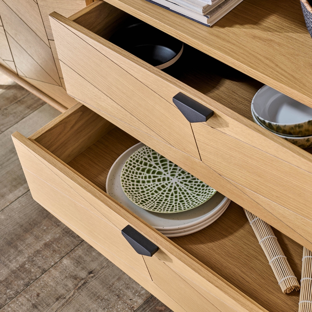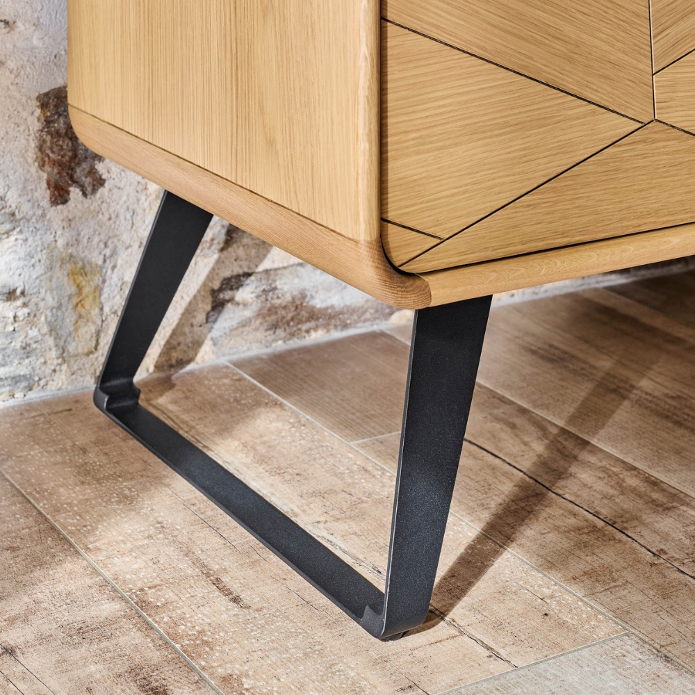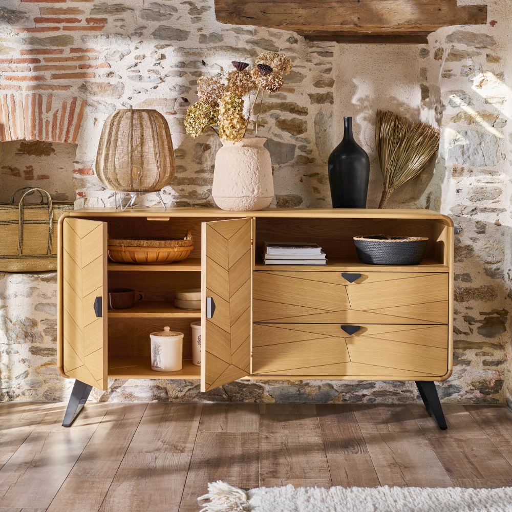 À gauche, deux portes s’ouvrent jusqu’à 150°, révélant un espace généreux et modulable, prêt à accueillir votre vaisselle, vos livres ou vos souvenirs. À droite, une niche ouverte attire le regard, surplombant deux tiroirs où le motif chevron file d’une façade à l’autre. Le chêne clair, délicatement veiné, s’élève sur un piètement trapèze en métal noir mat qui lui donne de l’élan. Angles arrondis, fermetures amorties, lignes nettes : précision et fluidité se répondent à chaque geste, dans un design qui apporte souffle et raffinement à la pièce.