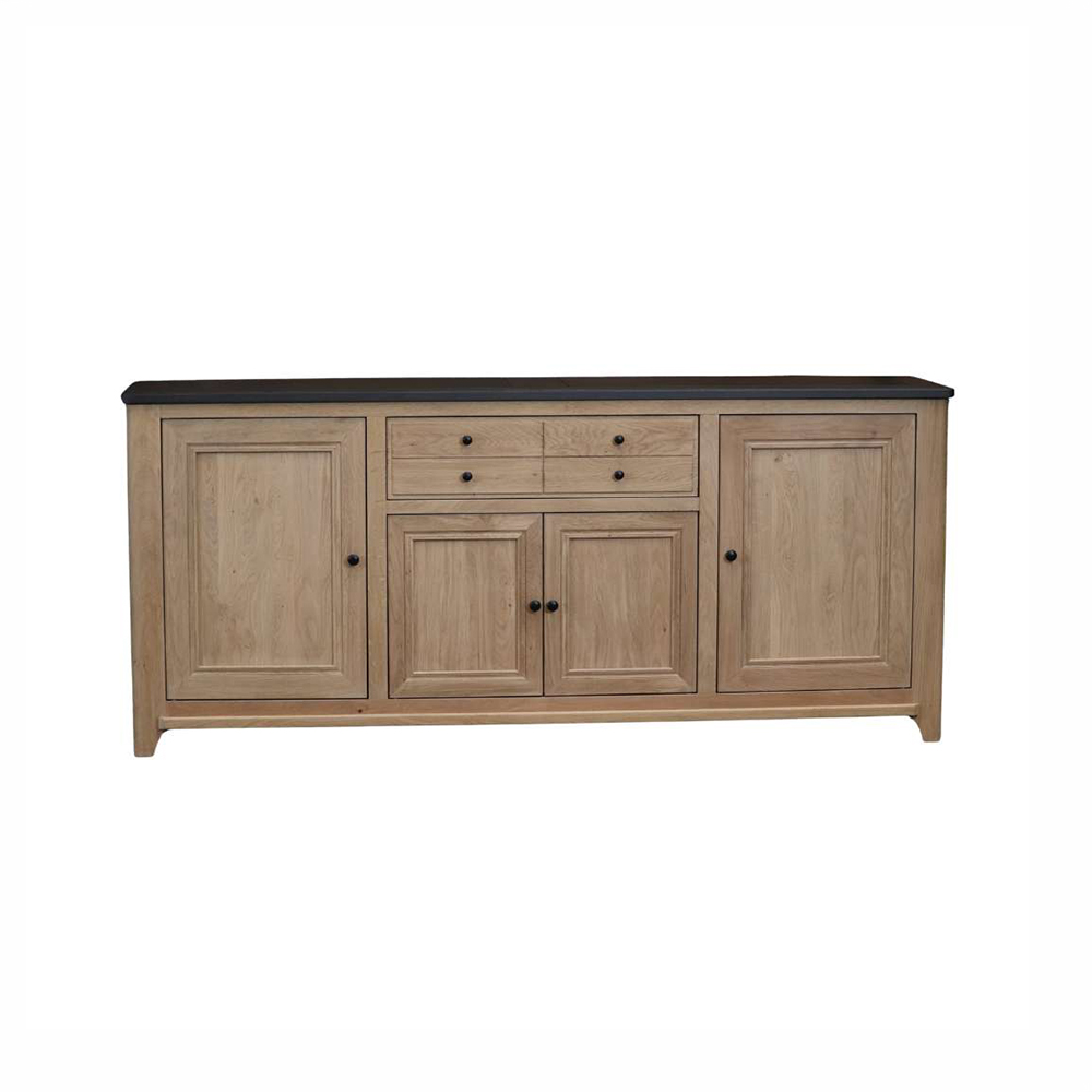 Meuble en chêne qualité rustique : petits nœuds, différences de couleurs, traces d'aubier en intérieur - 4 portes - 2 cloisons - 2 tablettes derrière chaque porte latérale, 1 derrière les portes centrales - 1 tiroir avec séparation centrale fixe (dimensions utiles de chaque côté : L 38 x H 15 x P 38 cm) - Dessus, avant, côtés, séparations : chêne massif - Portes : cadre en chêne massif, battantes, rotation sur pivots, fermeture par loqueteaux à pince, panneaux de porte chêne massif - Derrière et plancher : chêne massif ou abouté 20 mm - Baguette avant basse et pieds en chêne massif - Tablettes : chêne massif ou abouté laqué noir, réglables en hauteur sur taquets métalliques - Tiroir : chêne massif, assemblé à queues, coulisses avec amortisseurs et système de réglage en hauteur intégré - Teinte au solvant et vernis PU acrylique au choix pour le corps et le dessus - Meuble certifié Origine France Garantie - Existe en version 3 portes, longueur 190 cm.
