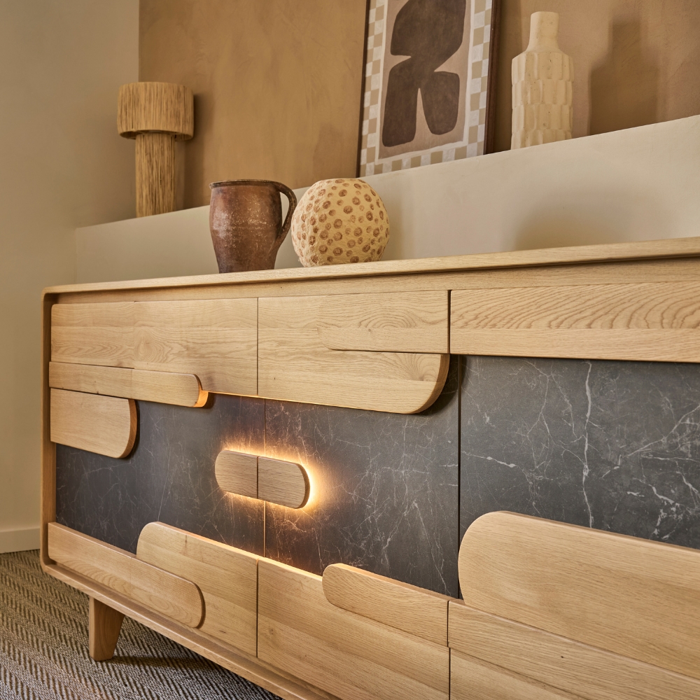 Sa façade est habillée d’un relief en chêne massif aux lignes horizontales et extrémités arrondies, qui semble glisser sur le fond minéral de la céramique. Ce jeu de volumes capte la lumière sous tous les angles, insufflant profondeur et énergie à la pièce. Derrière les portes, trois compartiments modulables offrent un rangement généreux, accueillant vaisselle, linge de table et autres objets du quotidien. Sept finitions de bois, trois variantes de céramique et l’option LED intégrée aux poignées centrales permettent de personnaliser chaque détail.