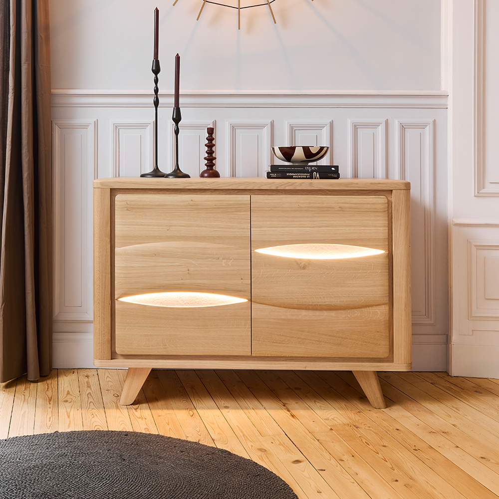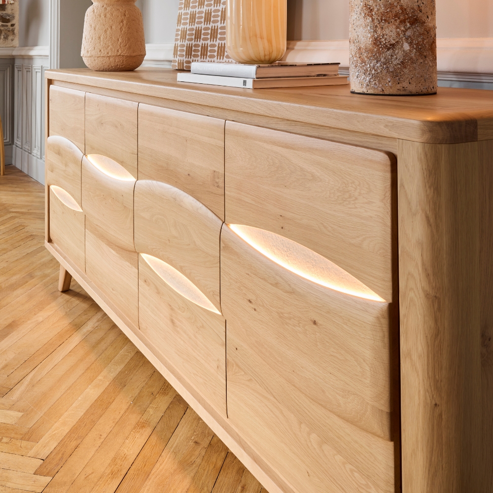 Sa conception en chêne massif joue la carte de l’arrondi, brisant la linéarité pour fluidifier la circulation dans votre pièce. En façade, les découpes en amande apportent un relief graphique que l’option d’éclairage LED vient sculpter pour une mise en valeur immédiate. Le plateau vous laisse choisir l’ambiance : la continuité chaleureuse du bois ou l’élégance minérale de la céramique. Côté pratique, ses quatre portes battantes ouvrent sur un beau volume de rangement, aménageable selon vos besoins avec un tiroir intérieur en chêne massif ou une tablette supplémentaire, disponibles en option. Avec 7 finitions de chêne et 3 variantes de céramique au choix, ce buffet se plie à vos envies de personnalisation.