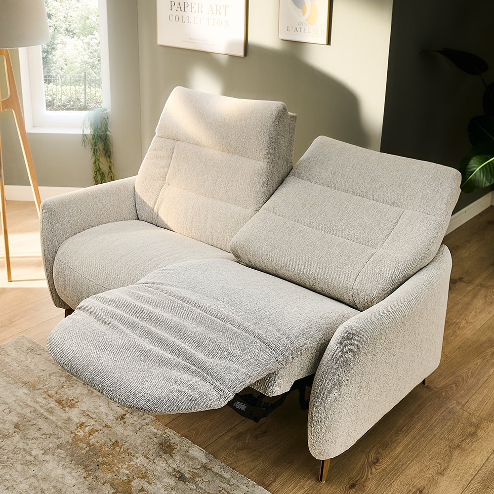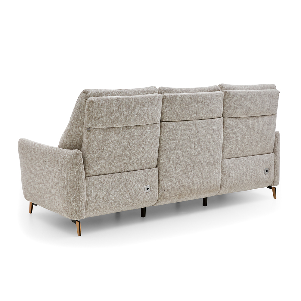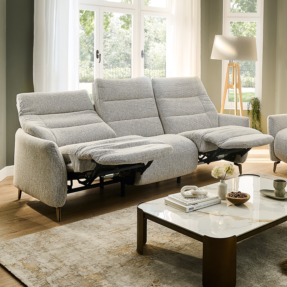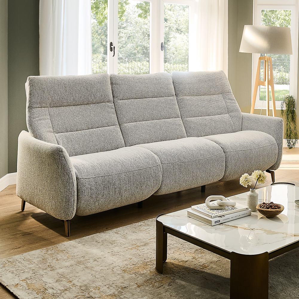 Disponible en cuir ou en tissu, avec plusieurs finitions de piétement, ce canapé de 235 cm de large peut être également équipé de réglages motorisés pour une relaxation sur mesure, sans encombrer l’espace.