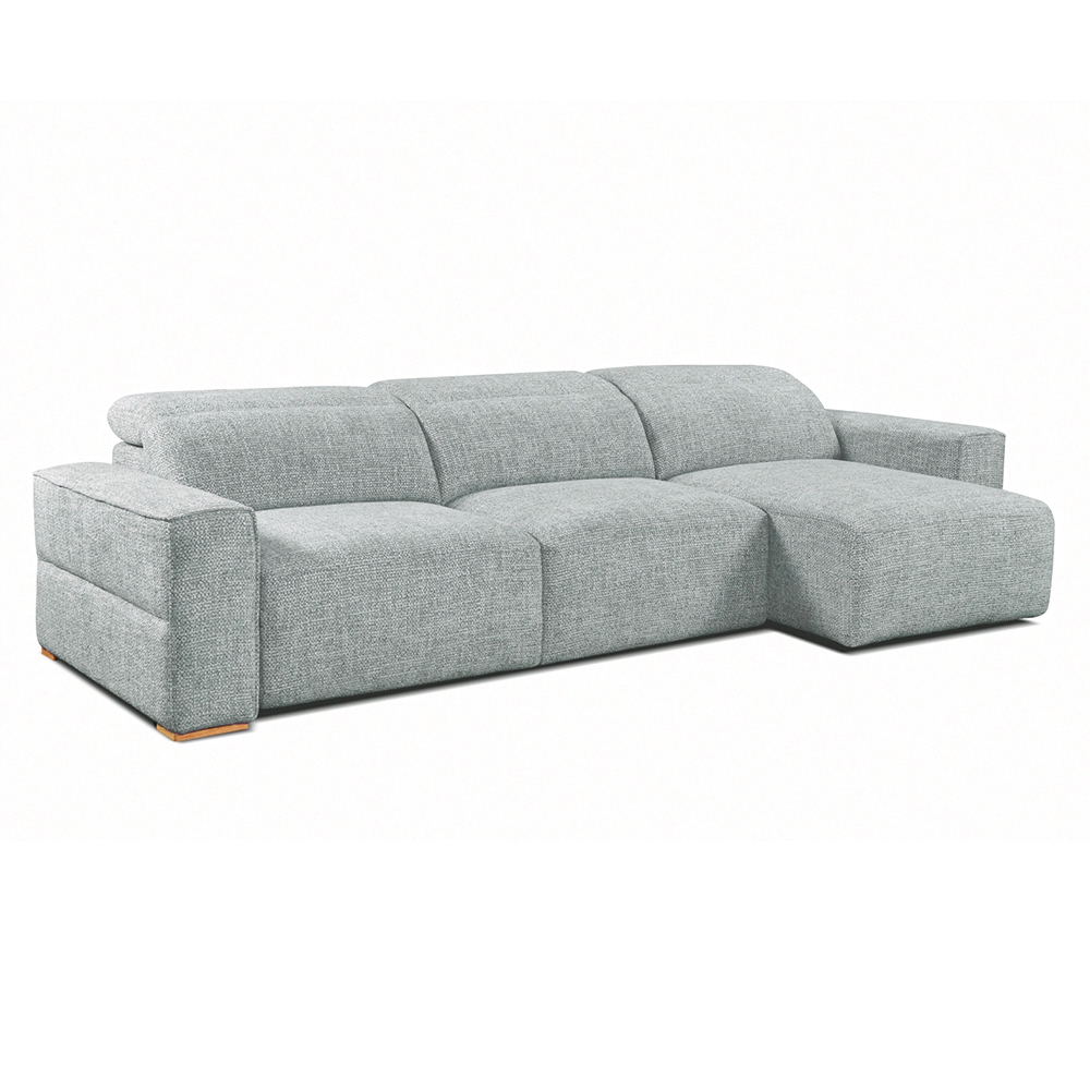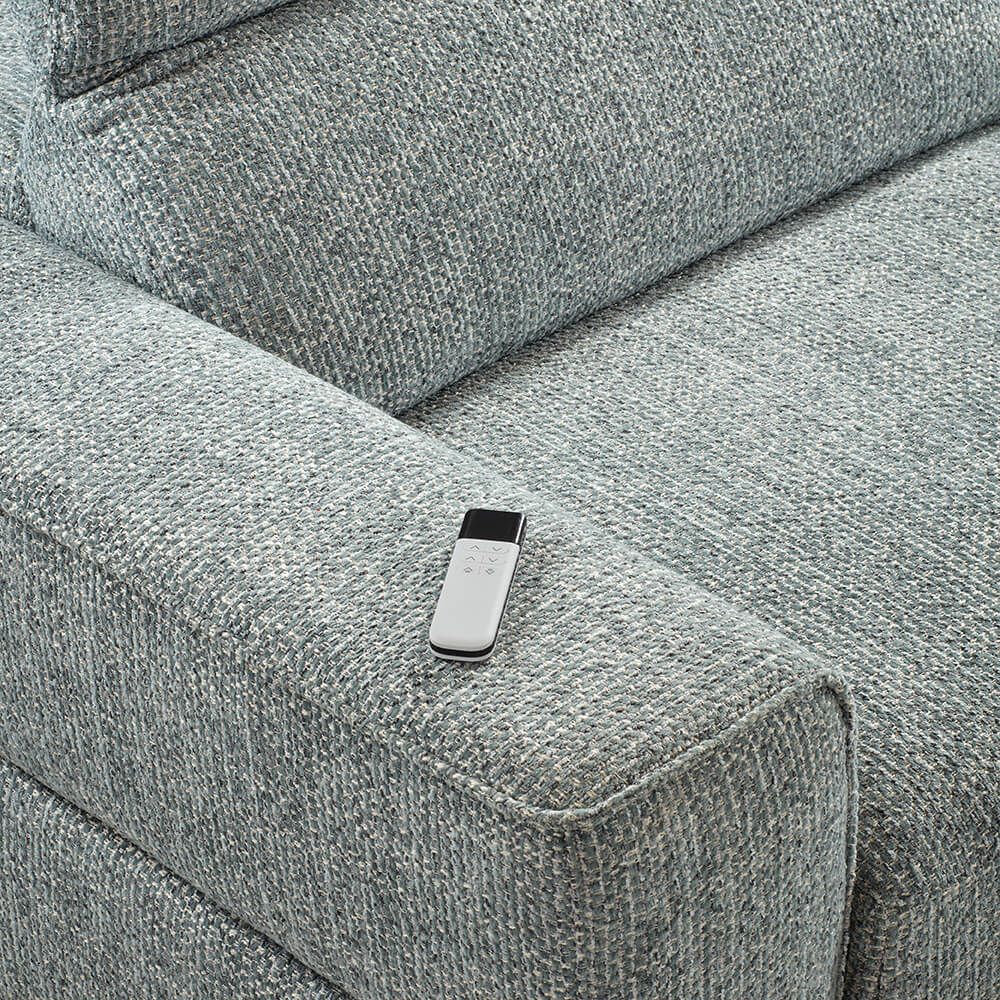 Structure en bois massif avec équerres renforcées - Suspension : ressorts métalliques zigzag pour l’assise, sangles pour le dossier - Garnissage assise : ressorts ensachés recouverts de mousse polyuréthane (28 kg/m³), dossier et accoudoirs remplis de mousse polyuréthane (25 kg/m³) - Mécanisme électrique dos au mur - 2 sièges coulissants électriques, chacun supportant jusqu’à 120 kg - Système électrique incorporé grâce à une télécommande pour l’ouverture des sièges extensibles - Têtières manuelles multi-positions - Disponible en 2 coloris au choix : bleu clair ou gris clair - Existe en version 4 places élec., 2 places élec., 2 places fixes et chaise longue 2 élec. avec coffre - Batterie en option.