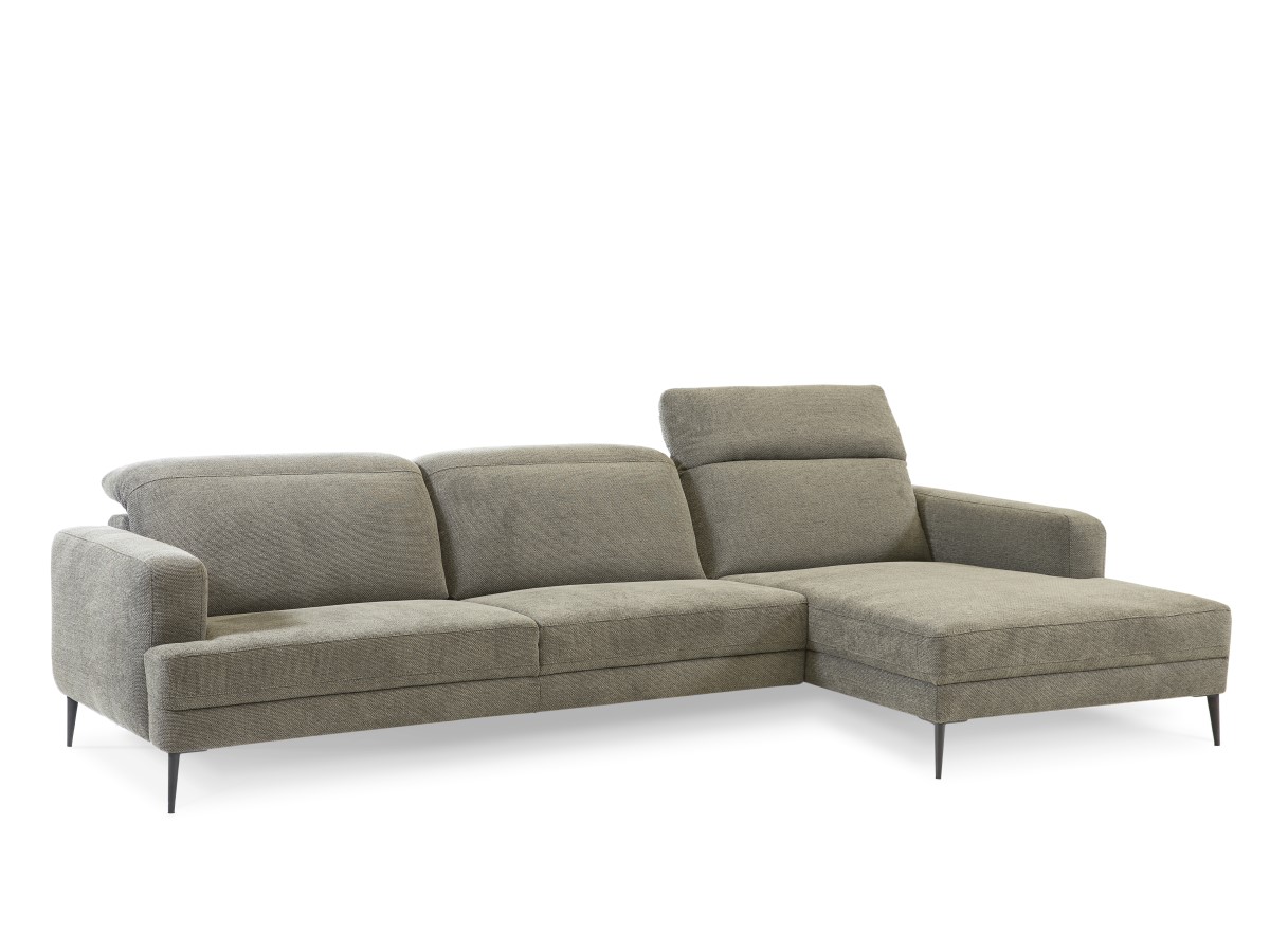 Le canapé d'angle en tissu Canosa offre grande capacité d'assise, têtières relevables et look léger grâce à ses pieds fins. Riche en possiblités de tissus, le canapé méridienne trouvera aisément sa place dans tous les salons contemporains.