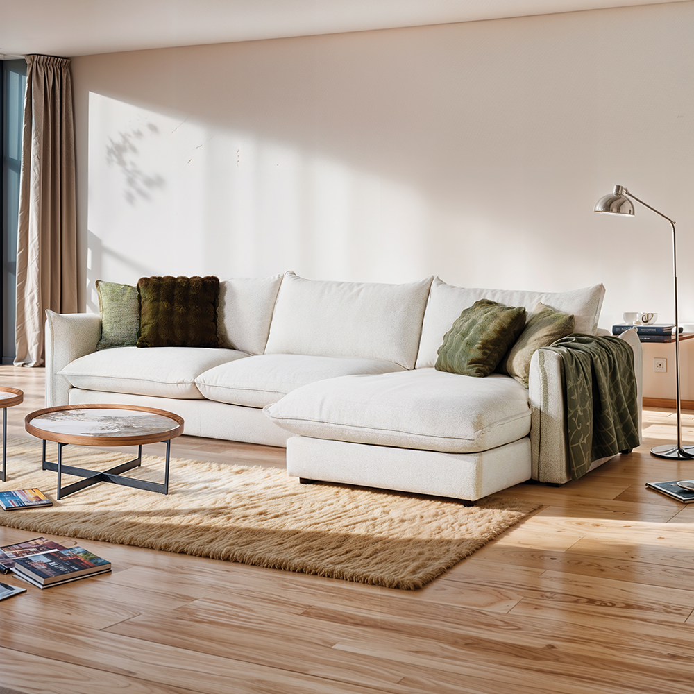 Avec ses 339 cm de largeur, le canapé d’angle MARANTA s'impose naturellement comme le nouveau centre de gravité du salon. Sa grande méridienne est une invitation permanente au lâcher-prise, tandis que ses lignes rebondies viennent adoucir la linéarité des intérieurs contemporains. Sous son tissu écru lumineux, son assise offre un confort équilibré qui conserve sa tenue au fil des saisons. Compagnon idéal des pauses café comme des soirées qui s’étirent, MARANTA se personnalise grâce à une large palette de tissus et existe également en version droite ou en fauteuil. Un essentiel élégant pour un intérieur à votre image.
