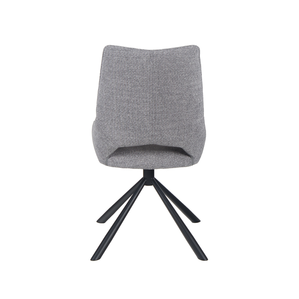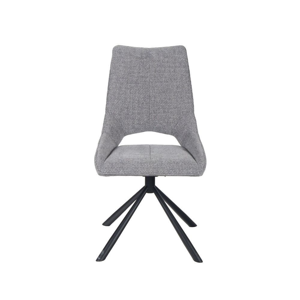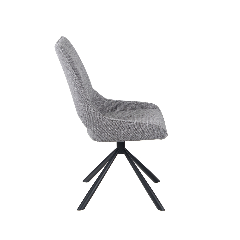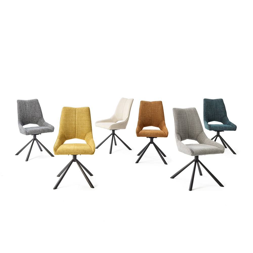 Chaise pivotante 180° - Structure métal - Assise et dossier mousse polyéther d'une densité de 25 kg/m³ - Piétement métal finition poudre noire - Tissu 100% polyester, disponible en 6 coloris : gris clair, anthracite, beige, jaune, rouille et pétrole - Existe aussi en version chaise de bar à piston hauteur d'assise réglable.