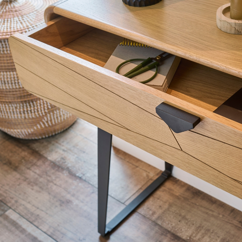 Le tiroir habillé du décor façon « chevron », signature de la collection, et d’une poignée triangulaire noire, organise vos essentiels avec praticité et discrétion. Compacte mais pleine de caractère, cette console structure un couloir ou un coin salon tout en laissant respirer l’espace.