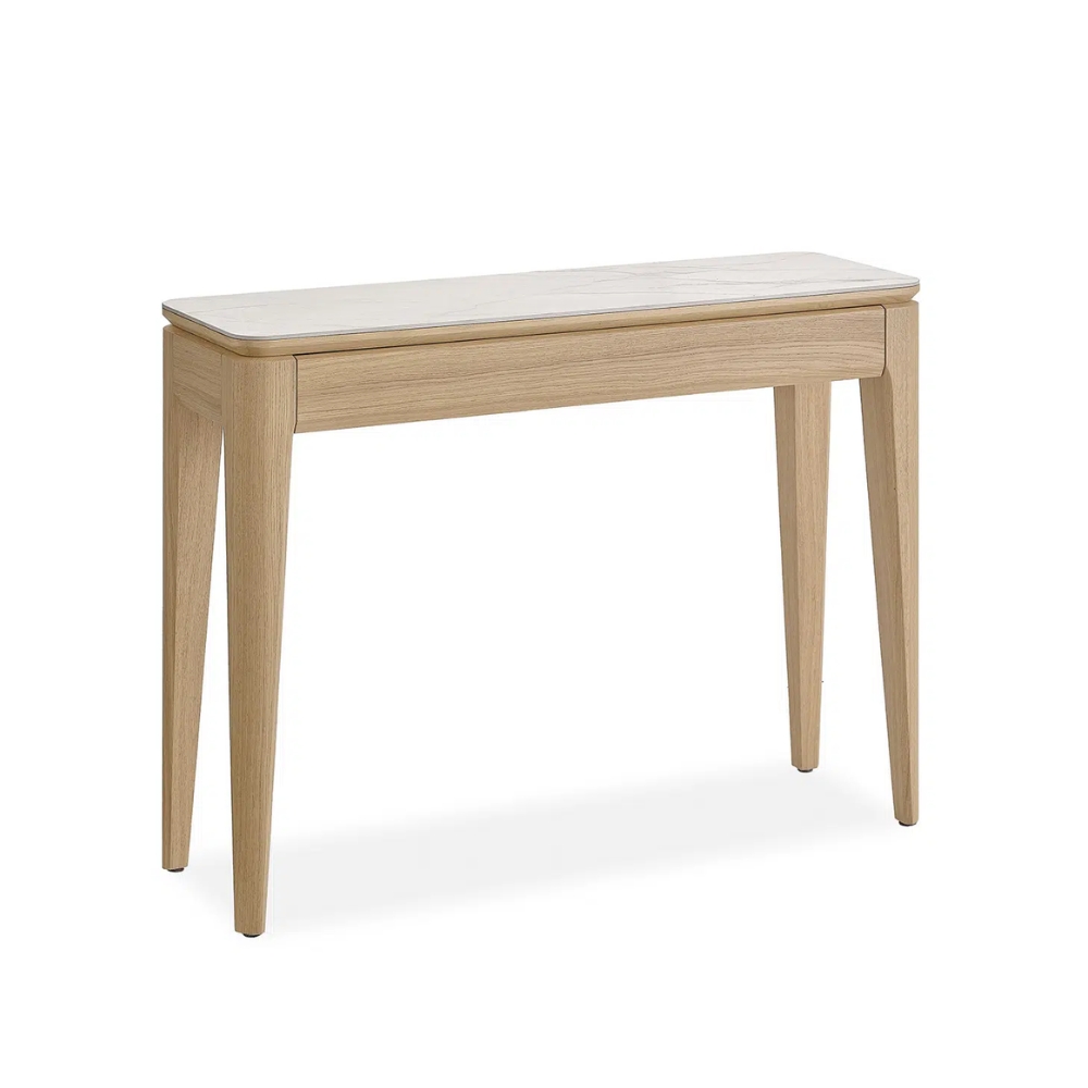 1 tiroir, fermeture avec amortisseur - Plateau : céramique collée sur panneaux de particules, finition au choix (beige veiné ou Dekton® brun panaché) - Pieds : Charme massif plaqué chêne - Tiroir : caisse en panneaux de particules revêtus de placage chêne, fond en panneaux de fibres moyenne densité revêtus de placage chêne - Finition bois : ton brut brossé, teinte acrylique, vernis de finition acrylique.