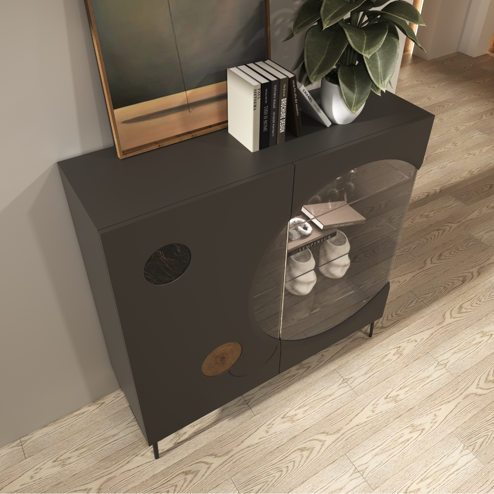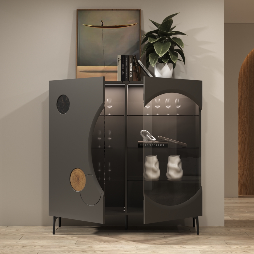 Présenté ici dans une finition noire intense, sa silhouette de 143 cm de haut impose un style moderne et affirmé. Les deux portes vitrées ouvrent une perspective sur vos objets favoris, tandis que les signatures de la collection en bois debout et céramique apportent un contraste organique subtil. Reposant sur des pieds fins en métal, il offre un volume de rangement généreux grâce à ses six étagères en verre, tout en conservant une allure aérienne. Le petit plus ? L'éclairage LED optionnel qui illumine l'intérieur du meuble, mettant en scène vos objets tout en créant un point de lumière chaleureux dans votre pièce.
