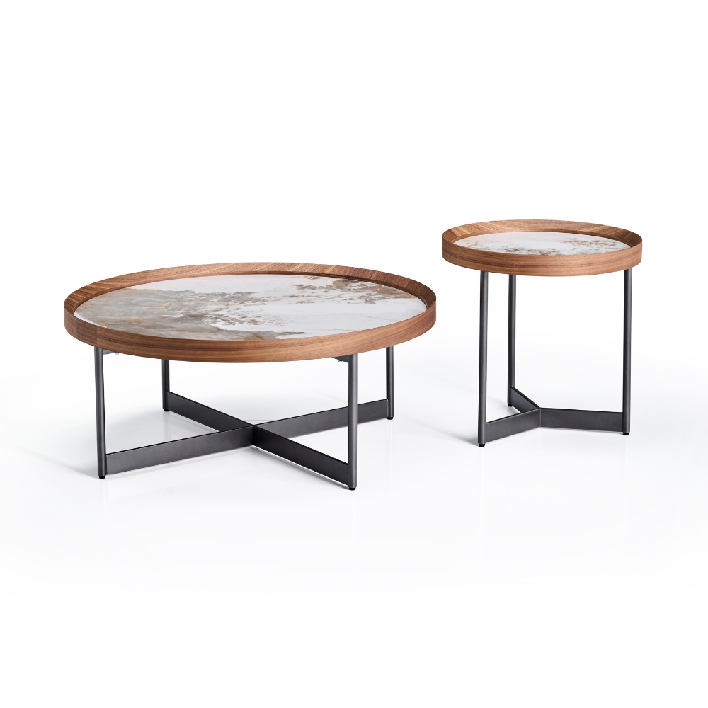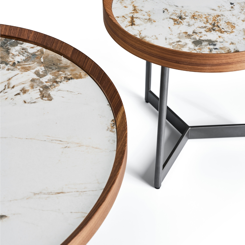 Dessus céramique brillante - Ceinture plateau : placage noyer - Piétement métal couleur bronze - Table basse : diamètre 90 cm, hauteur 38 cm - Guéridon : diamètre 50 cm, hauteur 50 cm.