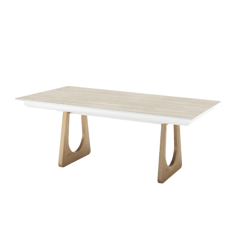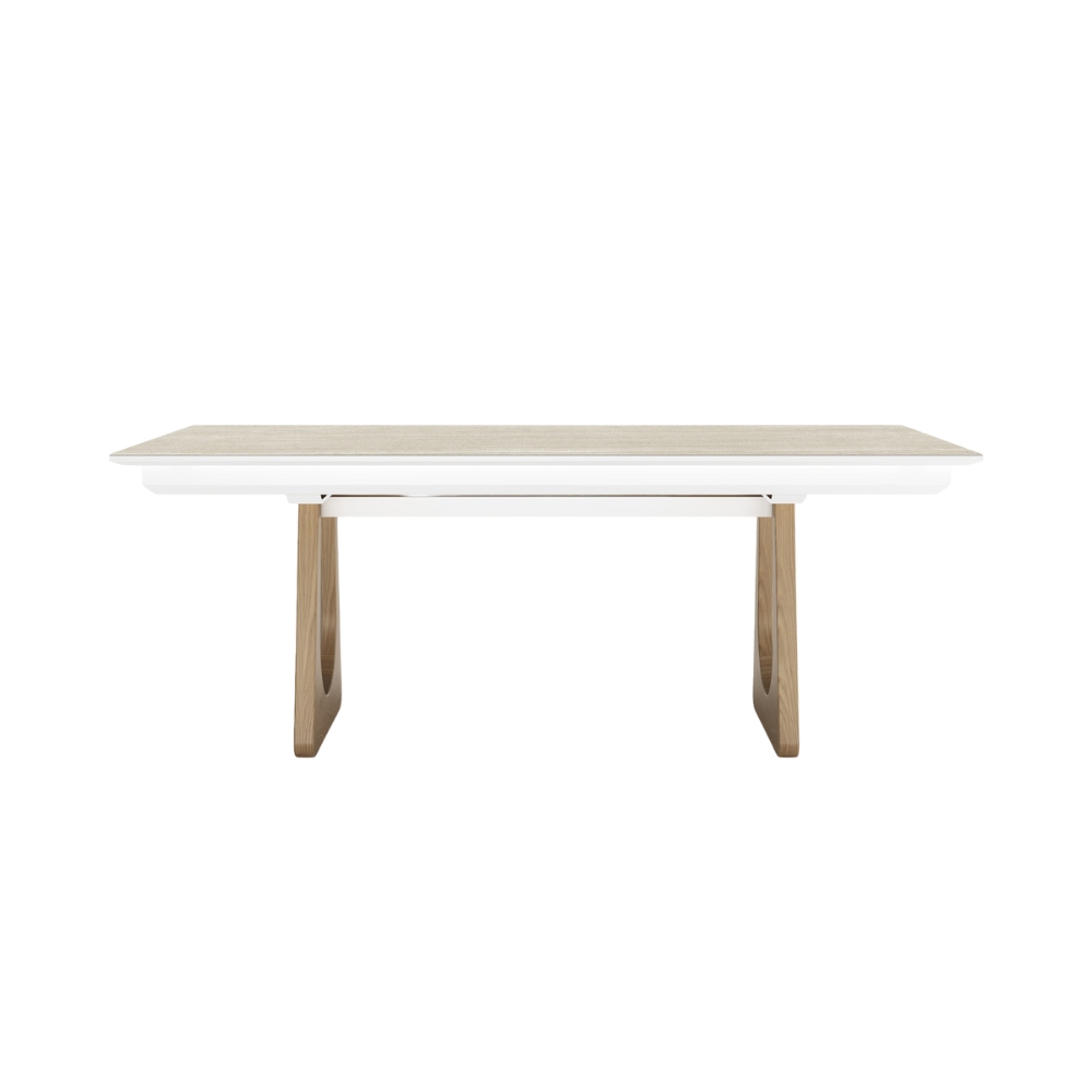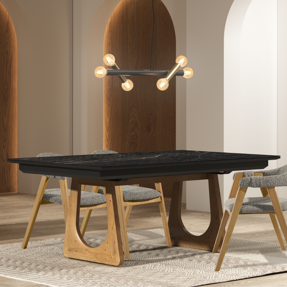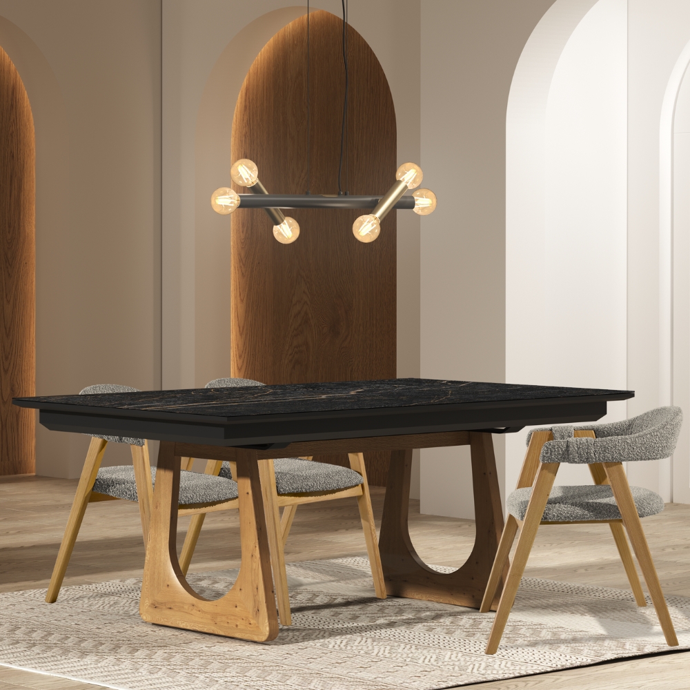 Véritable ode au design organique, cette table capte l'attention avec son piètement sculptural en bois massif, évoquant la force et la douceur des éléments naturels. Que vous optiez pour la chaleur authentique du chêne ou la noblesse minérale de la céramique pour son plateau, elle s'adapte à vos envies et à votre rythme de vie. Grâce à son ingénieux système d'allonges, elle passe en un clin d'œil de 160 cm à 260 cm de convivialité, et en version 220 cm, elle devient le cœur battant de vos très grandes tablées avec ses 320 cm d'accueil !