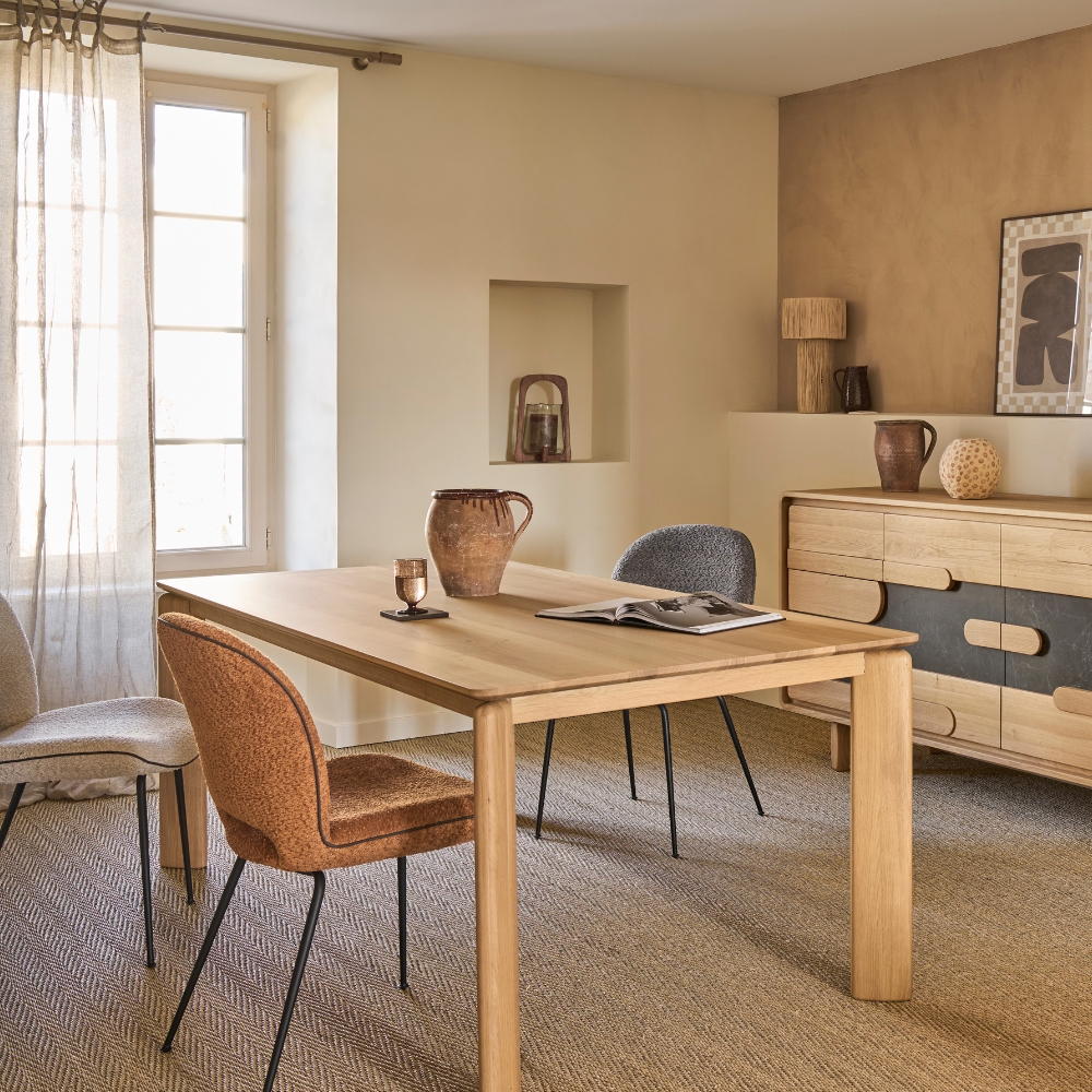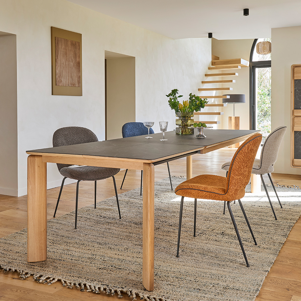 Son plateau, disponible en céramique ou en chêne massif, semble flotter au-dessus du piétement grâce à un subtil retrait qui allège la ligne. Les angles délicatement arrondis répondent aux codes de la collection éponyme et adoucissent la silhouette. D’un simple geste, l’allonge portefeuille de 90 cm se déploie, transformant la table en un espace généreux prêt à accueillir jusqu’à 270 ou 290 cm de convivialité selon le modèle. Déclinée en sept finitions de bois et trois variantes de céramique, elle s’intègre harmonieusement à votre intérieur.