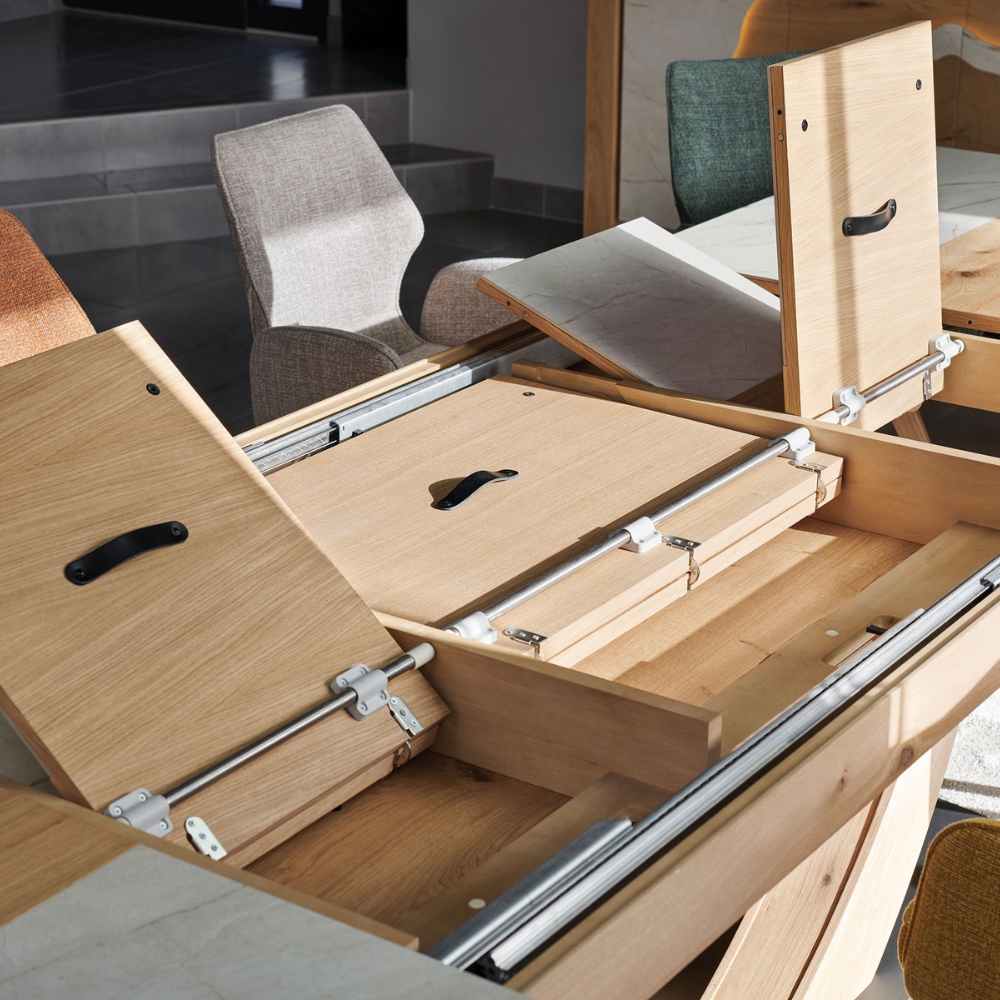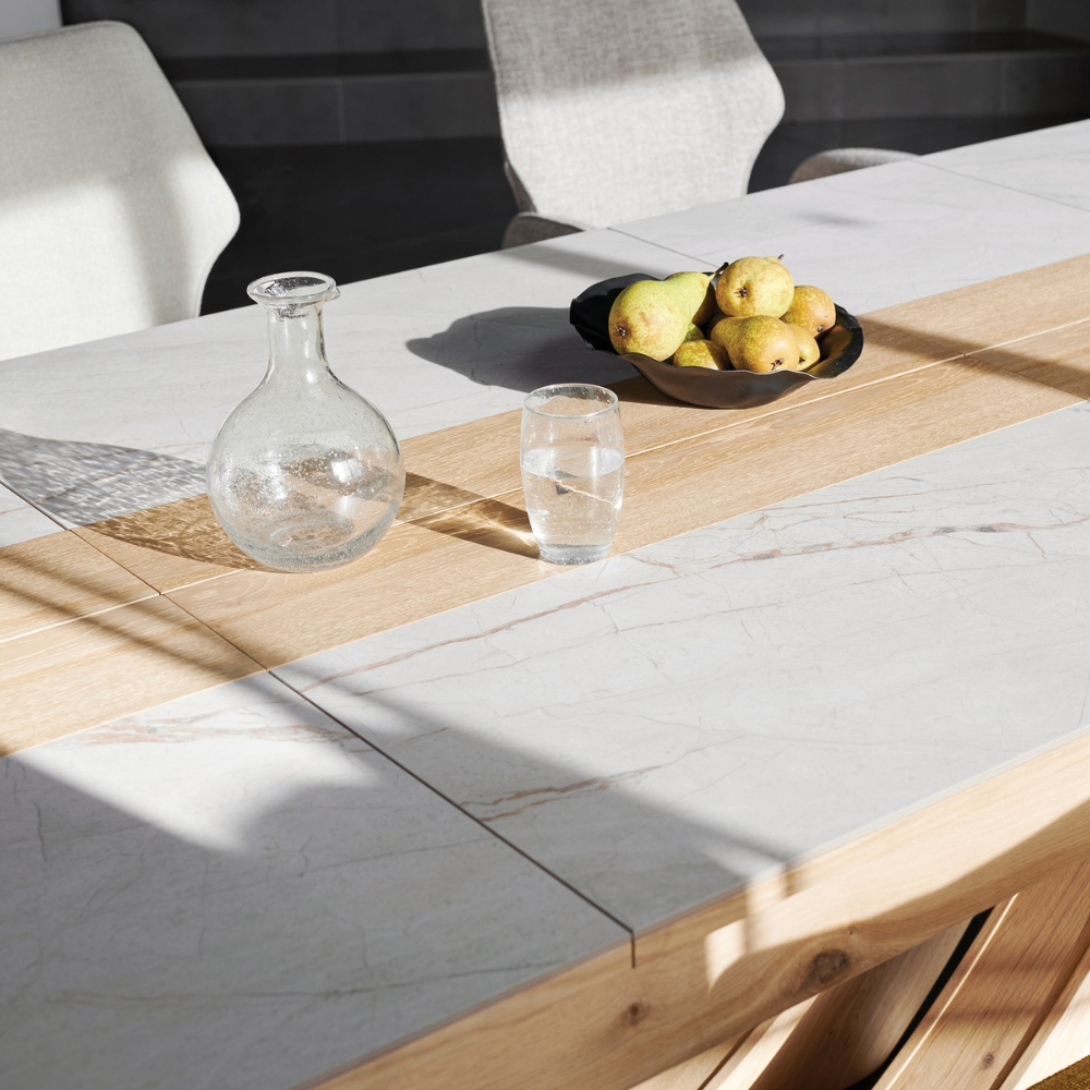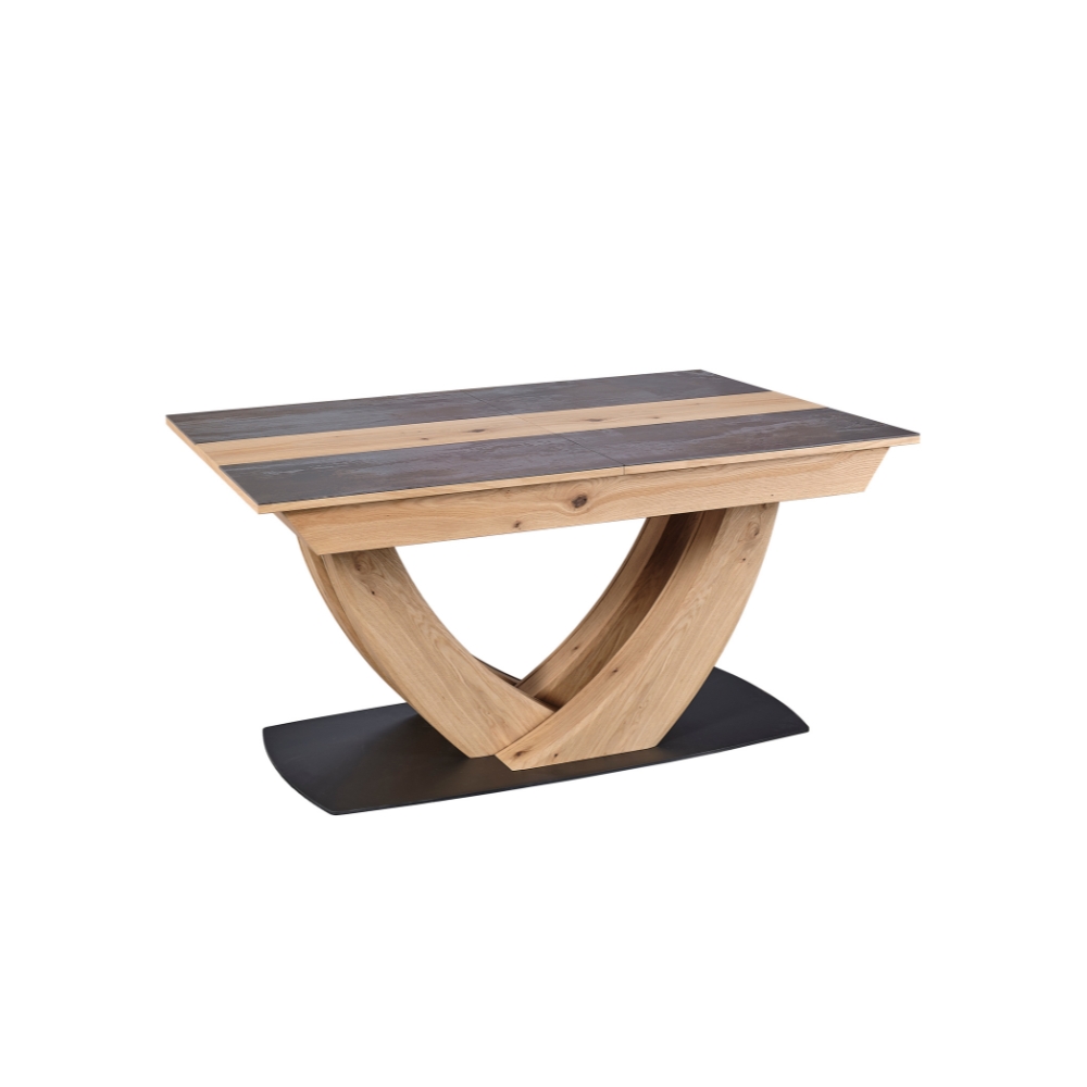 Plateau et allonge : céramique collée sur panneaux de particules, finition au choix (beige veiné ou Dekton® brun panaché) - 1 allonge centrale "papillon" de 80 cm - Longueur table ouverte avec 1 allonge : 270 cm - Coulisses métalliques - Ouverture synchronisée des 2 plateaux - Structure intérieure : charme massif - Traverses de ceinture : charme massif revêtus de placage chêne - Chemin de table en panneaux de fibres revêtus de placage chêne - Pieds en courbe : panneaux de fibres moyenne densité, multiplis et charme massif revêtus de placage chêne - Finition bois : ton brut brossé, teinte acrylique, vernis de finition acrylique - Existe également en 160 x 100 cm avec 1 allonge de 60 cm, et en 220 x 110 cm avec 1 allonge de 80 cm + 2 allonges de 45 cm.