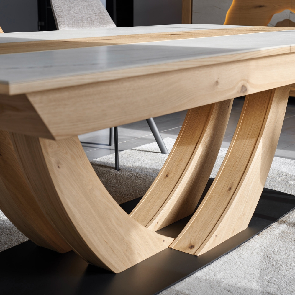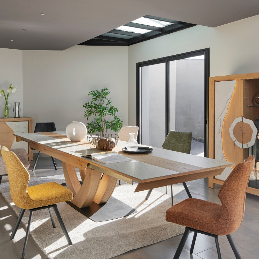 La table de repas extensible MINERALE impose son style avec une prestance naturelle, mêlant audace graphique et ingéniosité. On aime l'élégance de ses pieds en courbe qui soutiennent un plateau en céramique ultra-résistant, conçu pour accompagner tous vos moments de partage. Grâce à son système d’ouverture synchronisée et son allonge "papillon", elle se déploie en un clin d’œil pour accueillir jusqu’à 12 convives (et jusqu’à 18 dans sa version XL !). Une création robuste et spacieuse qui allie la force minérale à la chaleur du bois pour des réceptions sans fausse note.