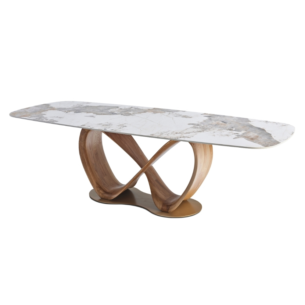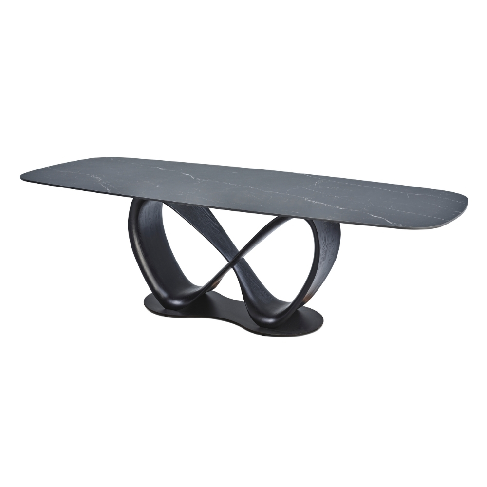 Plateau céramique de 12 mm, finition Elysium Marble Brown ou Black - Piètement en bois massif, disponible en 3 teintes : nature, brun et noir - Existe également en longueur 220 cm.