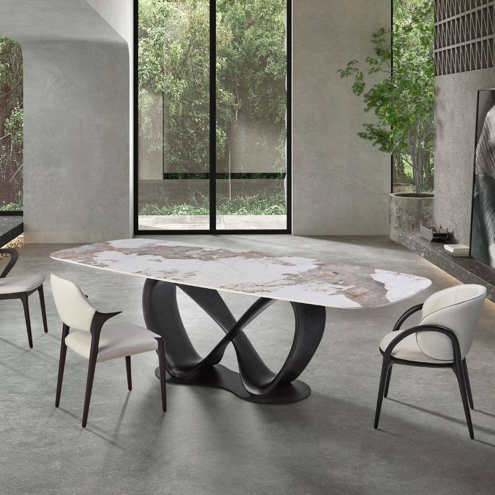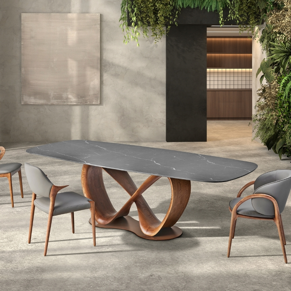 La table de repas LYRA séduit par l’élégance de son plateau en céramique disponible en deux finitions et l’allure sculpturale de son piètement en bois massif, décliné en trois teintes : nature, brun ou noir. Avec sa forme ovale et ses 260 cm de longueur, elle accueille jusqu’à 10 convives dans un esprit convivial et sophistiqué. Également proposée en 220 cm, la table LYRA impose sa personnalité avec douceur, entre présence naturelle et design parfaitement maîtrisé.
