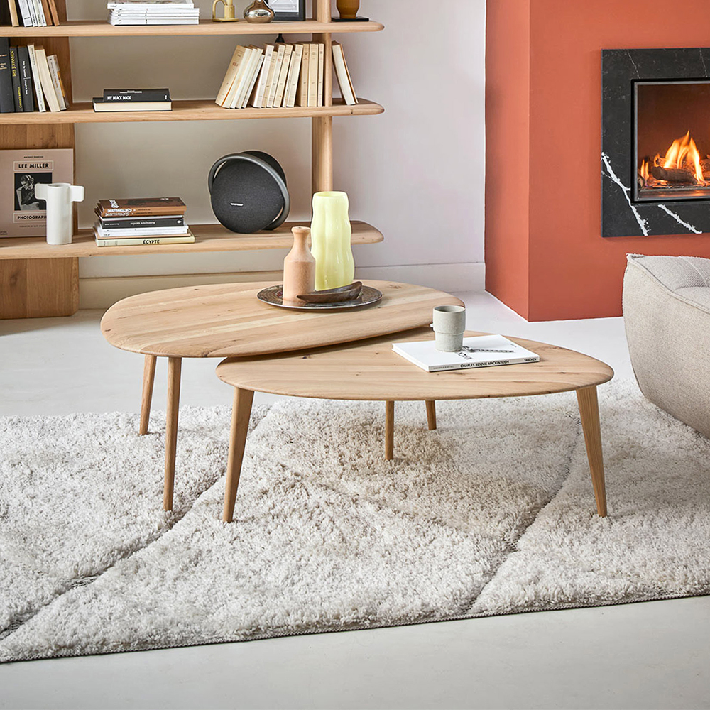 Les tables basses galets BOHEME séduisent par leur design nordique et authentique. Conçues en chêne massif, elles combinent un plateau ovale et un piètement tripode au charme intemporel. Leur format gigogne permet de varier les usages et les compositions : réunies au salon ou séparées dans la maison, elles trouvent toujours leur place. À la fois pratiques et élégantes, les tables BOHEME créent une atmosphère chaleureuse et conviviale. Pour un intérieur harmonieux, la collection complète BOHEME vous attend !