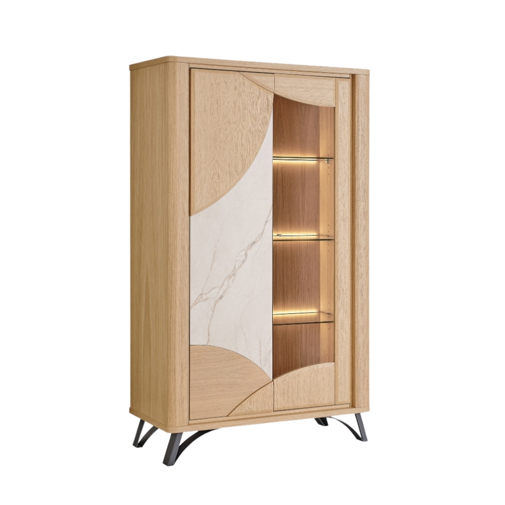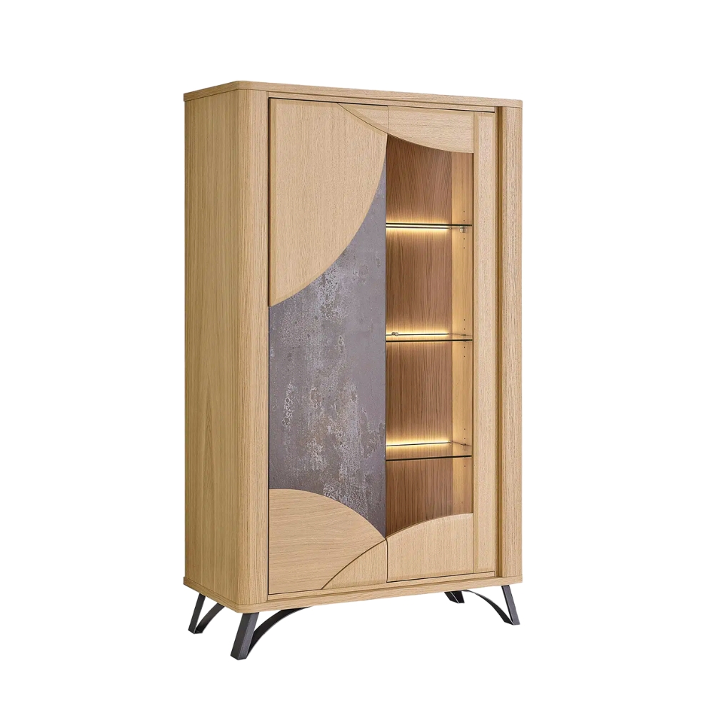 La vitrine 2 portes RIVIERA incarne cette rencontre entre caractère et modernité. Sa porte mi-bois mi-verre dévoile avec finesse vos pièces décoratives, tandis que la porte pleine de gauche préserve un rangement discret et fonctionnel. Élégante et intemporelle, elle réchauffe votre intérieur d’une touche contemporaine, que vient compléter un éclairage LED optionnel sur ses trois tablettes en verre.