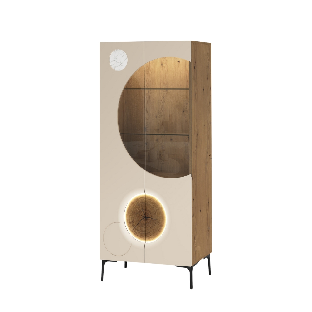 Dessus, base et côtés en mélamine laqué en face ou plaqué chêne 0,6 mm - Portes en MDF standard laquées mates ou brillantes avec applications de bois debout et céramique - Arrière et séparations intérieures en mélamine - 2 portes vitrées - 2 étagères fixes en mélamine - 2 étagères amovibles en verre - Pieds en métal laqué - Plusieurs possibilités de finitions - Option : éclairage LED façade et intérieur - Existe en version 2 portes pleines.