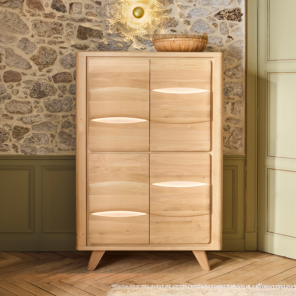 Ses lignes en chêne massif, adoucies par des angles arrondis, encadrent deux portes vitrées qui mettent en scène vos objets préférés. La partie basse, plus ancrée, offre derrière ses portes pleines un grand espace de rangement structuré pour votre quotidien. L’éclairage LED avec variateur, disponible en option, vient sculpter les reliefs des portes basses et illuminer l'espace vitré pour révéler toute la profondeur du meuble. Entre ses 7 teintes de bois et ses 3 déclinaisons de céramique au choix, cette vitrine devient une pièce maîtresse parfaitement coordonnée à votre décor.